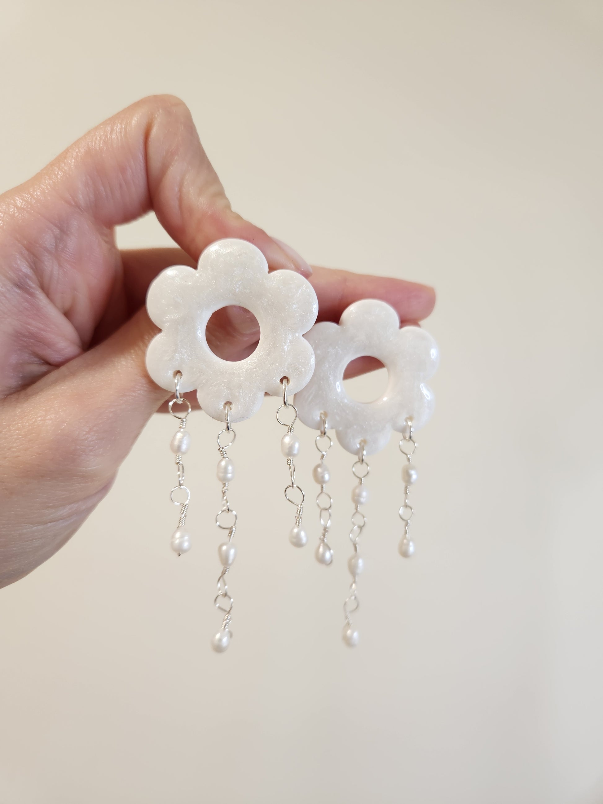 Aro de arcilla polimérica con forma de flor, con efecto perlado.